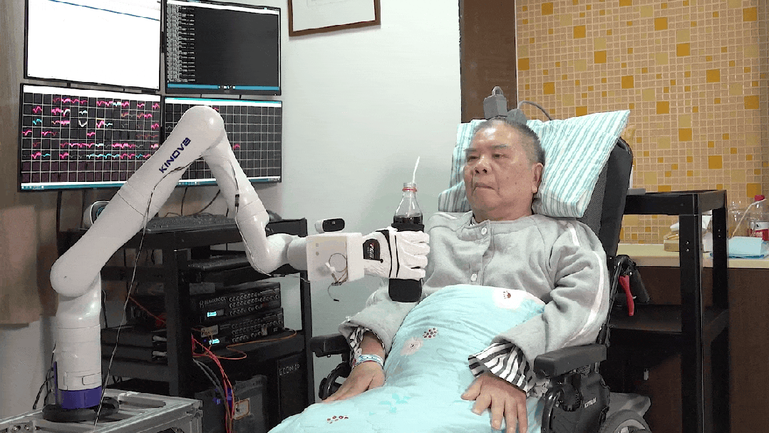 一个月后,陈先生开始使用脑机接口的诊疗系统。头戴的脑电帽能够提取患者的运动意识,再将运动意识传给外接设备,由外骨骼带动肢体进行运动,反馈信号又通过外周神经传给大脑。在经过 42 次训练后,他的肢体逐渐能够恢复运动。出院时,他的力量已经接近正常,可以回归正常生活,并回到了之前的工作岗位。