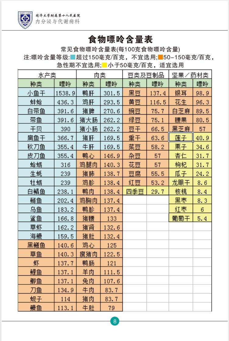 每百克食物当中嘌呤含量超过小于50毫克的,我们称之为低嘌呤食物,在表格中标记为黄色的食物,可以自由选用。