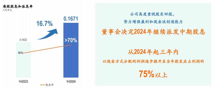 今年上半年,中国电信继续派发中期股息,派息率超过70%。中国电信又一次强调,从2024年起,三年内公司以现金方式分配的利润将逐步提升至当年股东应占利润的75%以上,继续为股东创造更大价值。