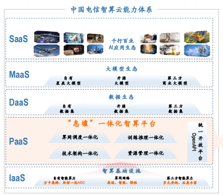 中国电信智能云体系从下往上分为IaaS层、PaaS层、DaaS层、MaaS层、SaaS层。IaaS层即智算基础设施,包括中国电信的自有智能算力、算间网络以及第三方智能算力。PaaS层最为关键,“息壤”一体化智算平台是整个体系中的核心组件、核心能力,提供极致的算力调度服务、高效的一体化计算加速服务、普惠的一站式智算服务等。