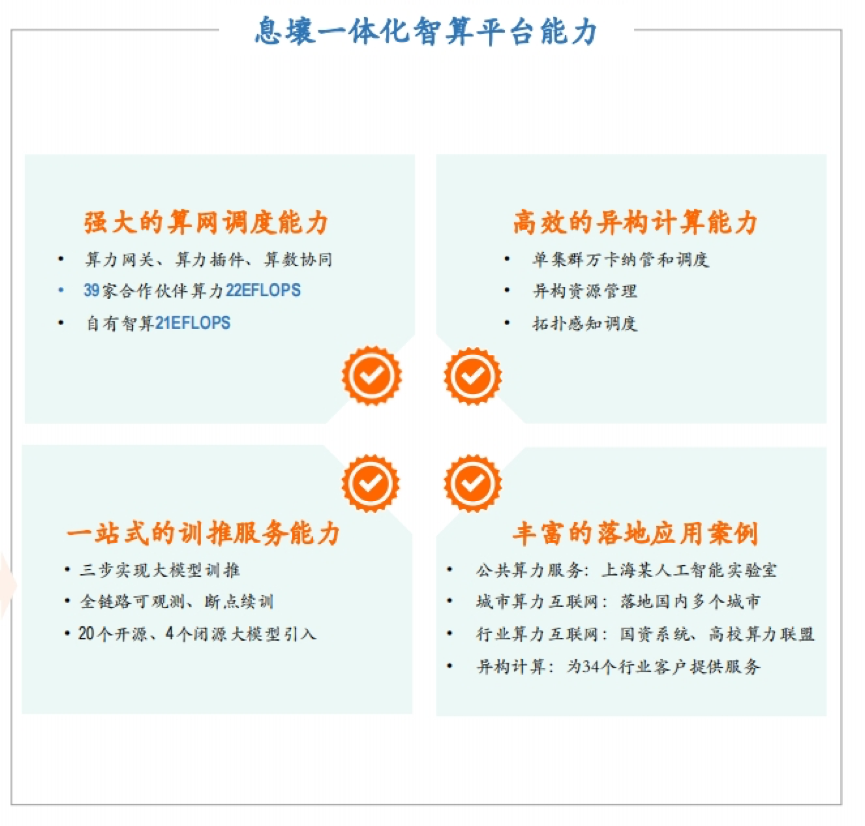这还不是全部,除了自有的21EFLOPS智能算力,中国电信还携手39家产业链伙伴合作,将合作伙伴22EFLOPS算力接入中国电信一体化智算服务体系中。如此一来,中国电信拥有40多EFLOPS智能算力向客户提供服务。