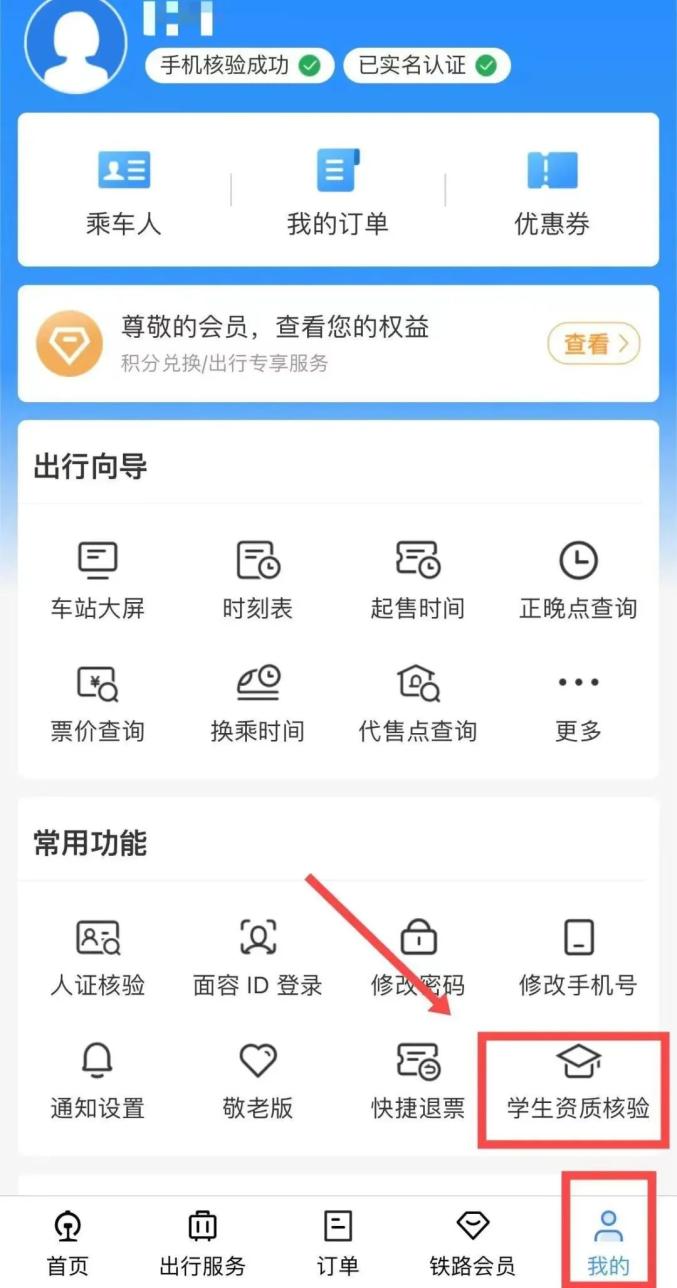 第二步:打开铁路12306 APP→我的→学生优惠资质核验专区填写相关优惠信息(姓名、证件号码、学校和家庭所在地、预计毕业年份)→提交审核后,购买学生优惠票即可。