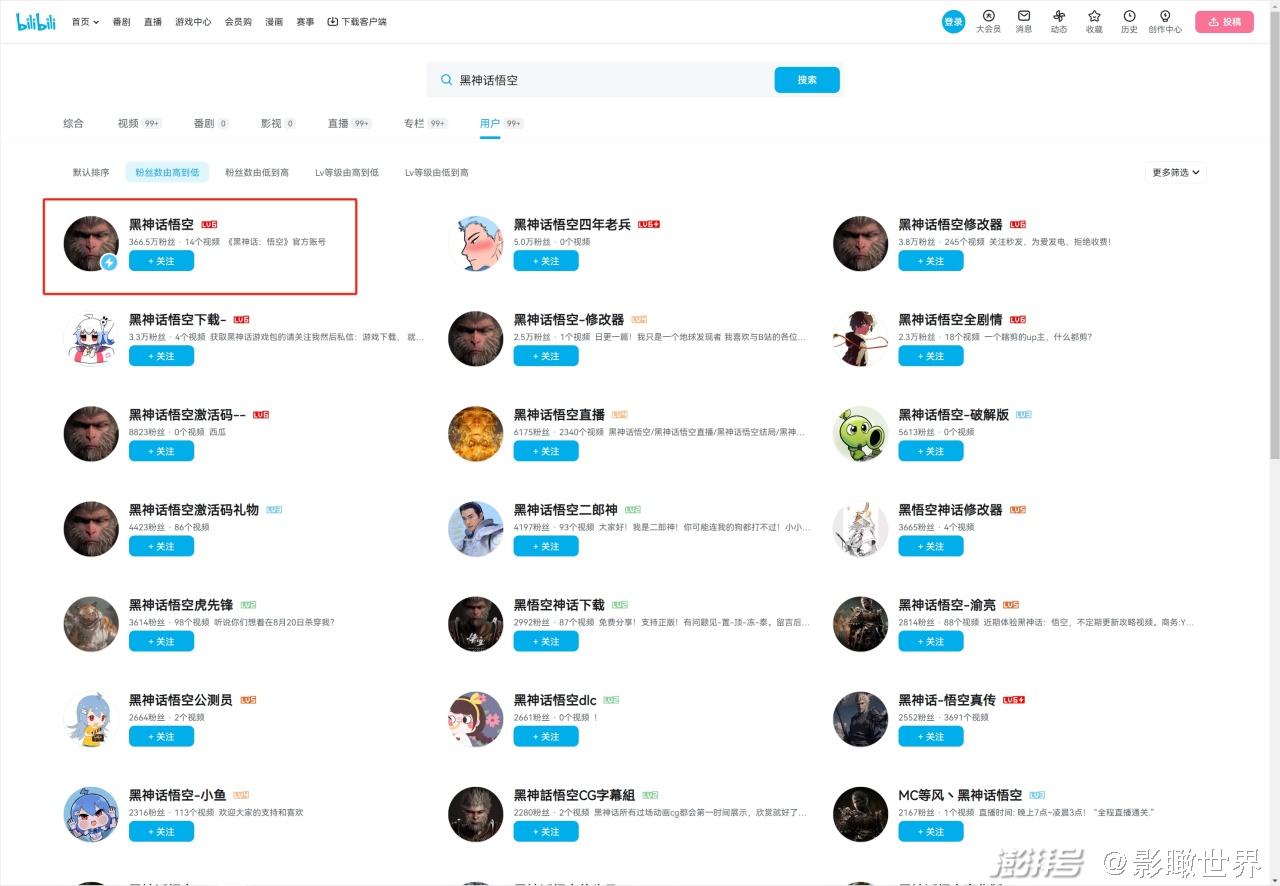 B站上《黑神话:悟空》官方账号以及爱好者账号