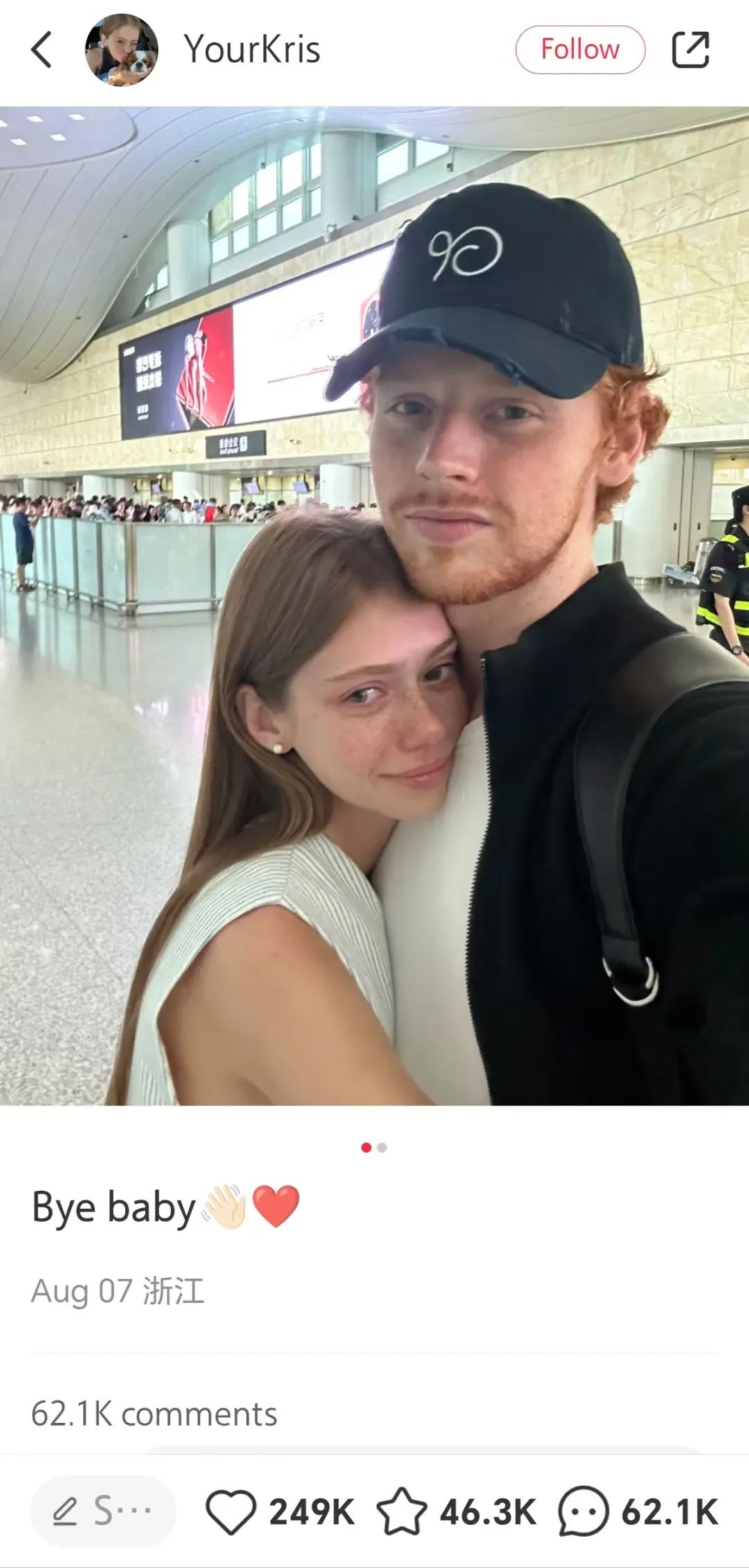 本月早些时候,一位名为YourKris的博主在中国社交平台上发布了两张她与男友分别时感伤瞬间的照片。