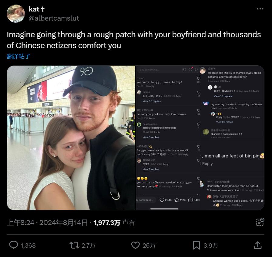 而没过多久,这些高赞的留言就被另一名外国博主转帖到了其他网络论坛上:想象一下你和男友出现感情危机,而成千上万的中国网友在安慰你……