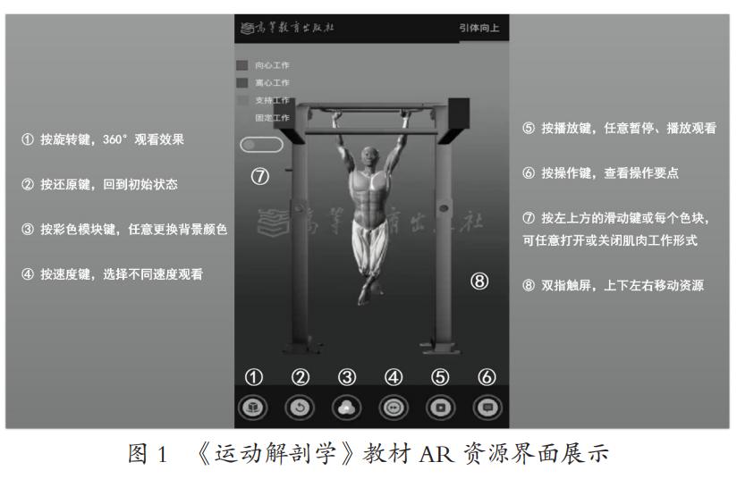 “运动解剖学”是一门研究体育运动对人体形态结构和生长发育影响的学科,探索人体机械运动规律及其与体育运动技术之间的关系。相比其他课程,它具有术语繁多、知识点复杂、部分内容抽象等明显特点。传统的《运动解剖学》教材大多用图文结合的方式,插图多以黑白线条图片和静态运动动作图片为主,很难让学生清晰、直观、生动地理解“运动解剖学”的课程教学内容。在元宇宙环境下,高等教育出版社出版的新版《运动解剖学》教材根据学生年龄特点和身心发展规律,围绕课程目标和运动项目特点,制作了 40 余个运动动作的肌肉人,利用 AR 技术立体化展示运动状态下,人体肌肉有向心工作、离心工作、支持工作、固定工作等工作模式。通过与虚拟模型的互动,学生可深入理解运动解剖学原理在实际运动中的应用,如跑步时腿部肌肉的变化、引体向上时身体肌肉的发力顺序等。这种沉浸式、直观的学习体验将极大地激发学生的学习兴趣和识记效果,使“运动解剖学”这一原本较为抽象的学科变得生动有趣且易于理解,从而大幅提升教学效果(图 1)。