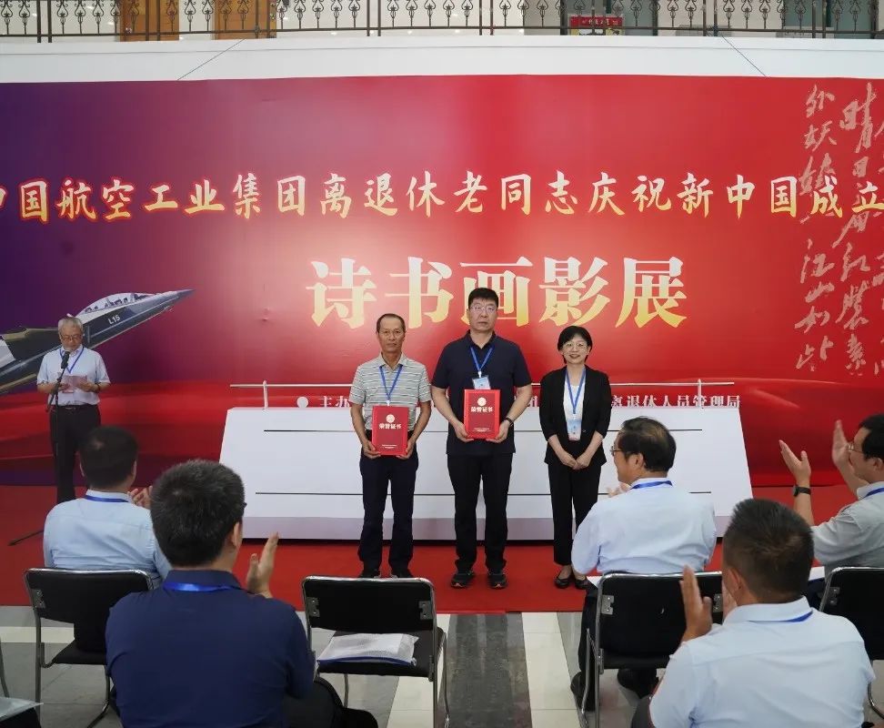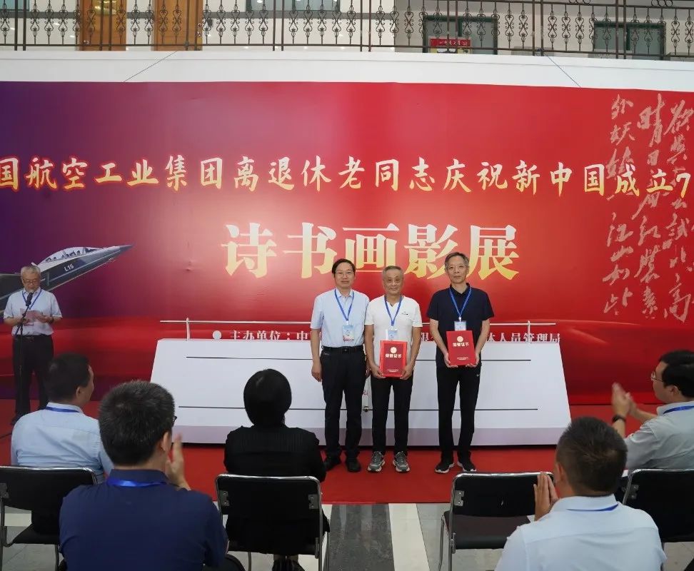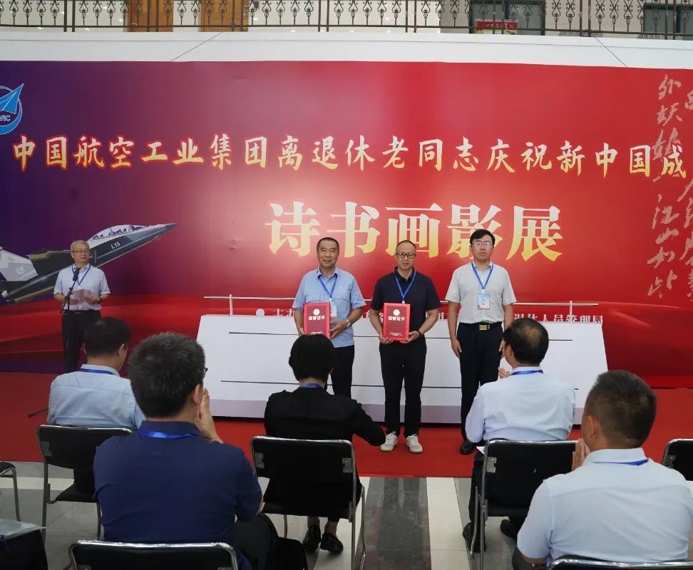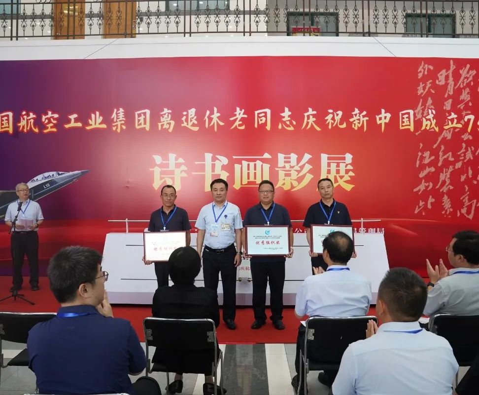 ▲现场为优秀组织奖单位和部分获奖代表颁奖本次诗书画影展活动为期5天,中国航空工业集团广大老同志踊跃参与,由62家单位选送的475件书法、绘画、摄影作品参与评审,最终评选出51件书法作品、42件绘画作品、47件摄影作品参展,其中有9位90岁以上的老同志作品入选,98岁高龄的原航空航天工业部部长、党组书记林宗棠也送来了墨宝,中国航空工业集团老干部部“晚晴诗社”16位老同志创作的诗词作品作为特邀作品也一同参展。