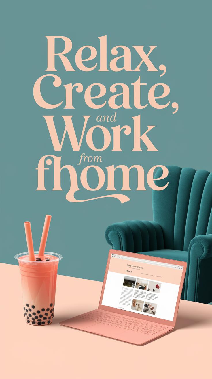 Prompt:A modern website design with a bubble tea theme. The background is a soft teal color. There's a peach bubble tea with tapioca pearlsin a clear cup. Next to the cup is a peach laptop with a blog post open. There's a comfortable teal chair with a curved back. The text "Relax, create, and work from home" is written in a modern font.