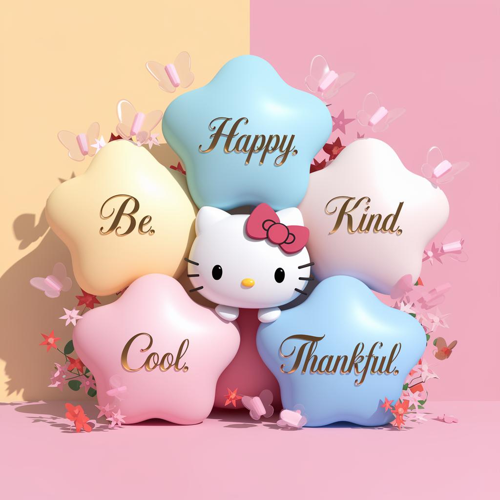 prompt:A 3D render illustration of Hello Kitty in a celebration of love. Hello Kitty is the centerpiece, surrounded by five fluffy,star-shaped objects that glow with warmth and life. Each star displays a word in elegant golden italics: "Be," "Happy," "Kind," "Cool," and "Thankful." The background is a vibrant, contrasting yellow and pink. The scene is enchantingly adorned with soft pink transparent butterflies, small red and orange hearts, and delicate white flowers, adding a touch of romance and whimsy.