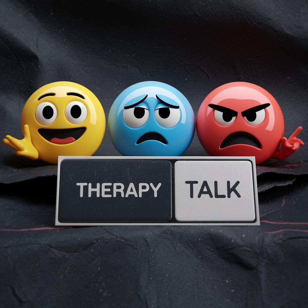 prompt:A 3D render of three emojis (Happy, Sad, and Angry) in a new fashion style. They are placed on a dark paper background. In front of the emojis, there is a panel with the text "Therapy Talk" written on it. The overall image has a great weather effect.