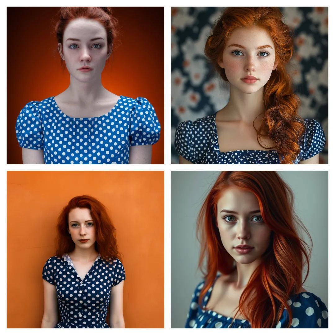 Prompt:a young woman with red hair in a blue and white polka dot dress, in the style of helios 44-2 58mm f/2, intense coloration, photo-realistic techniques, dark orange and white, intensity, simplicity, webcam photography.
