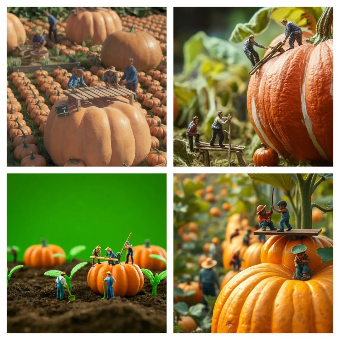 Prompt:A group of farmers are hard at work in the fields, they grow small vertical garden-like pumpkins. In one elaborate scene, tiny people make planks on top of giant, oversized pumpkins. The background is chloroplast, creating a cinematic feel. High-definition detail captures Descartes's resolution, creative composition and bold close-up shots of miniature character states, axial displacement photography, exquisite detail, 8K.