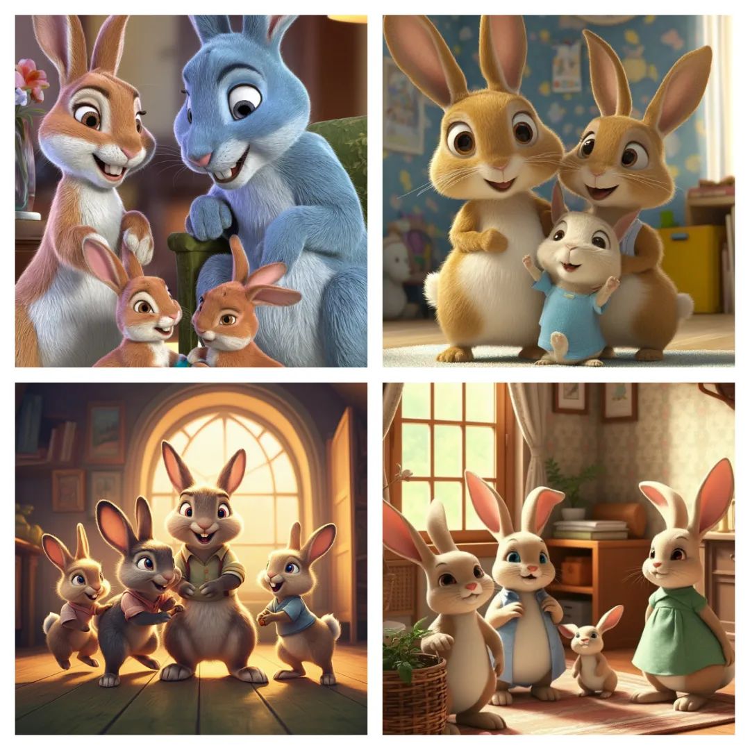 Prompt:The rabbit family plays happily in the room, Disney style, 3D, high detail.