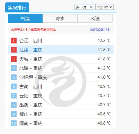 据中央气象台官网信息,来源于2418个国家级气象观测站的数据显示,截至8月22日17时,在逐小时气温实况排行榜中,川渝地区气温在当天11时至17时连续7个小时霸榜全国高温榜“前十”。其中,四川合江在17时以42.2℃热到了全国第一。