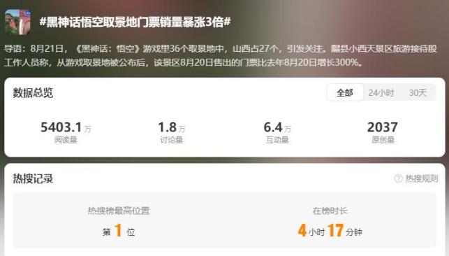 近两年,各地文旅局“卷”得厉害,不时别出心裁搞营销,为当地旅游挖潜吸粉。在这样的语境中,面对瞬间爆火的《黑神话》,各地文旅集体蹭热点,也在情理之中。毕竟,景区借助游戏IP走向年轻人走向更广阔的世界,也是不错的尝试。而且从数据上看,市场反馈也立竿见影:游戏上线后,山西省大同、朔州等城市搜索热度持续攀升,玉皇庙、崇福寺、小西天、铁佛寺、双林寺等游戏取景地的游客数量也不断创新高。