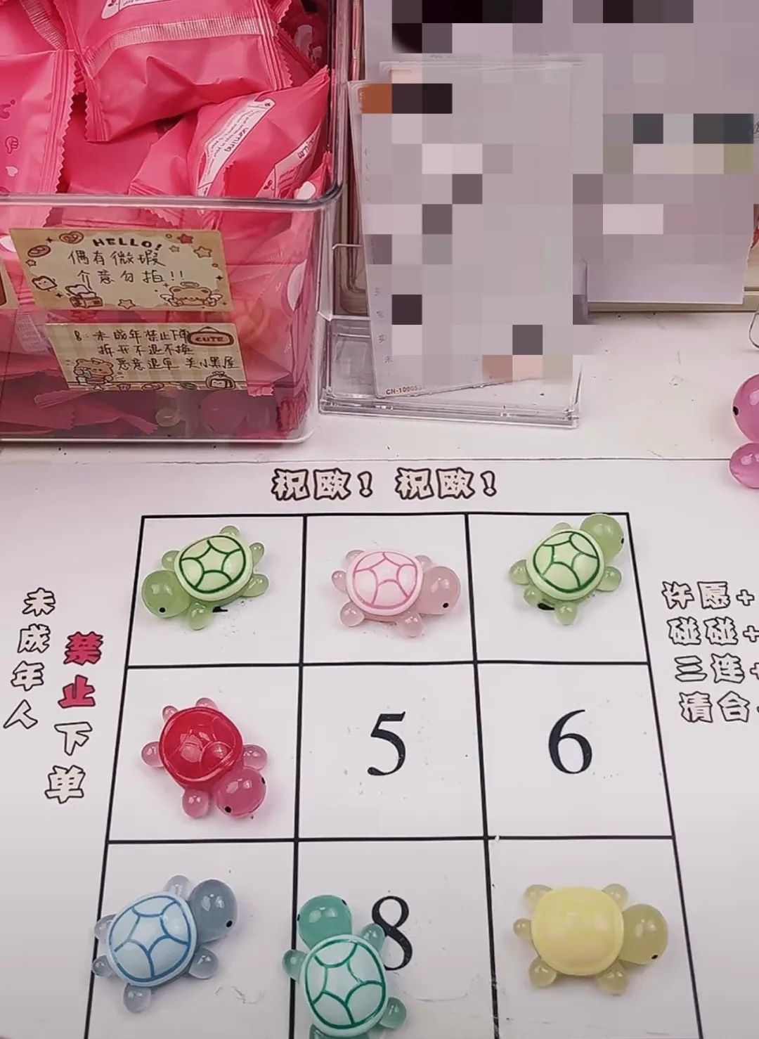 /图片来源于网络“乌龟对对碰”是什么?打开直播间,不少直播主已经当上了这款游戏的庄家。不同颜色的小乌龟玩具被装在“盲袋”里,玩家下单购买一定数量的“盲袋”,并许愿一个“幸运色”。等待庄家拆开盲袋,并将小乌龟摆在九宫格上,如果拆出的小乌龟颜色和排序符合奖励规则的话,直播主播会赠送一定量的盲袋给玩家,然后接着拆,直到不再符合赠送条件为止。