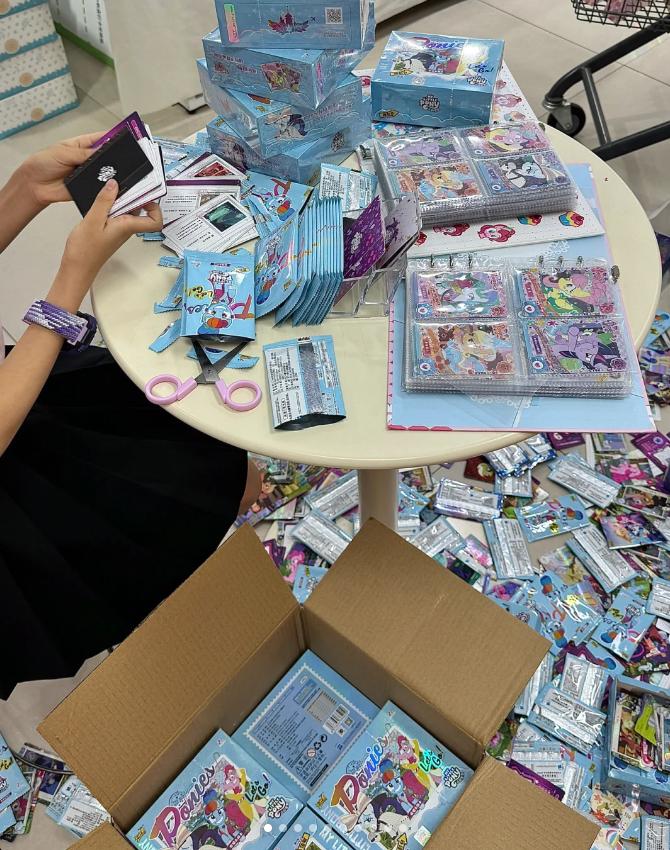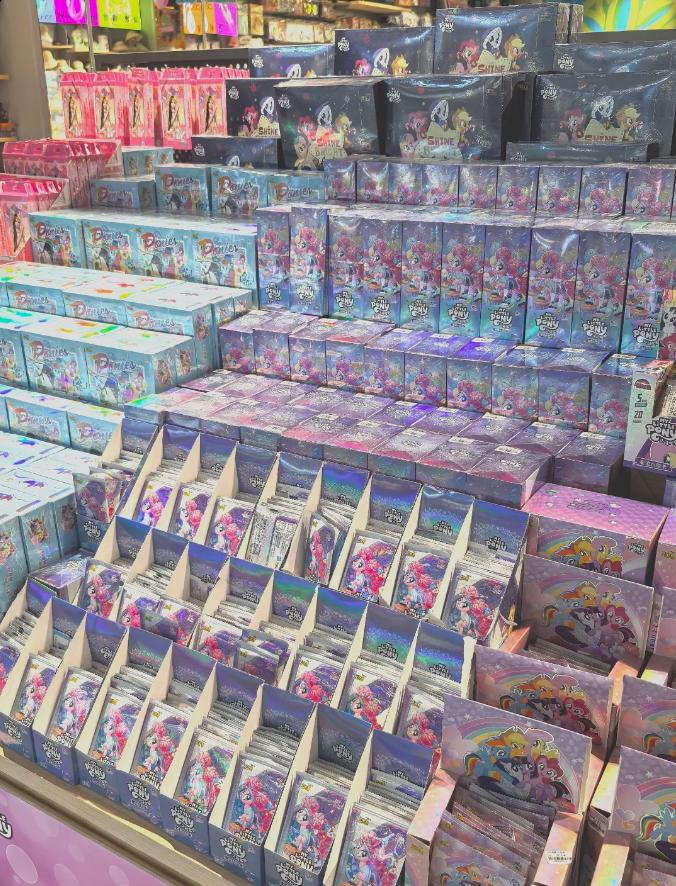 走进校门口的文具店,或者商场里的精品店,会发现小马宝莉的周边卡开始侵占最优的货架位置,不少人站在周围激情消费这些盲盒式的卡片,乐此不疲地进行豪赌。各种五颜六色的小马驹似乎成为了孩子们热烈追捧的新“偶像”。