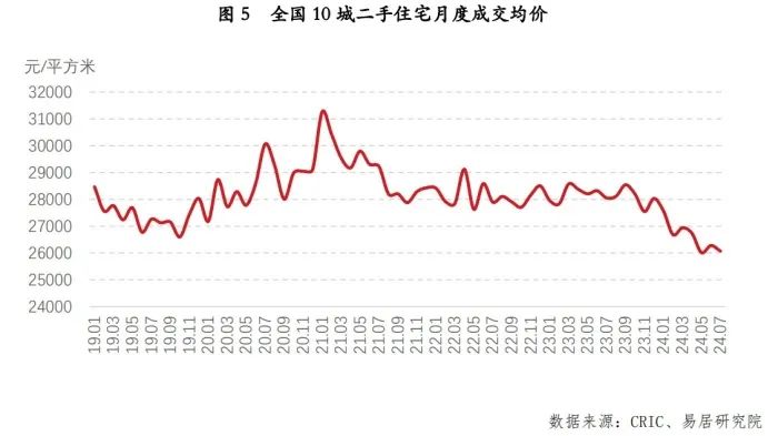 图片来源:易居研究院价格方面,7月,全国10个重点城市(即北京、上海、广州、深圳、杭州、合肥、南京、天津、武汉和重庆)的二手住宅成交均价为 26073 元/平方米,环比下降了1%,同比下降7%,是本轮二手房价格调整周期中价格次低水平(其中5月份均价为 26013 元/平方米,为最低水平)。