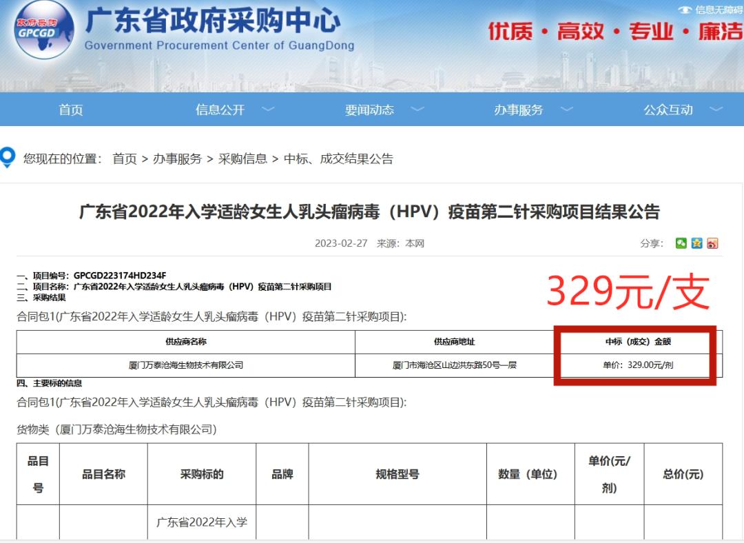 2022年,万泰生物中标广东省入学适龄女生人乳头瘤病毒(HPV)疫苗第二针采购,单支价格为329元。