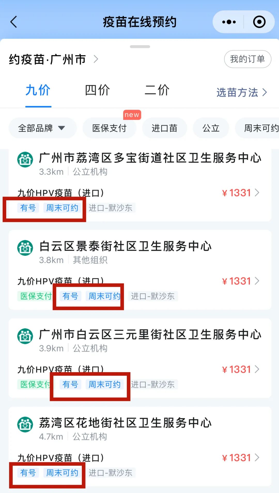 39深呼吸在某疫苗预约平台发现,随时都能预约进口九价HPV疫苗,广州多个社区卫生服务中心都显示“有号”、“周末可约”,价格都为单针1331元。