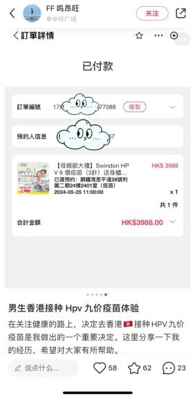 ◎ 男性博主晒出的帖子。/图:小红书截图博主FF 鸣昂旺说,他在某平台选择了香港一家诊所,购买了3针HPV疫苗,价格一共是3988元港币;另一位博主Ing说,他选择了香港西九龙高铁站附近的诊所接种,每次提前打电话预约,下了高铁就能去打,历时8个月打完了3针,共花了3500元人民币。