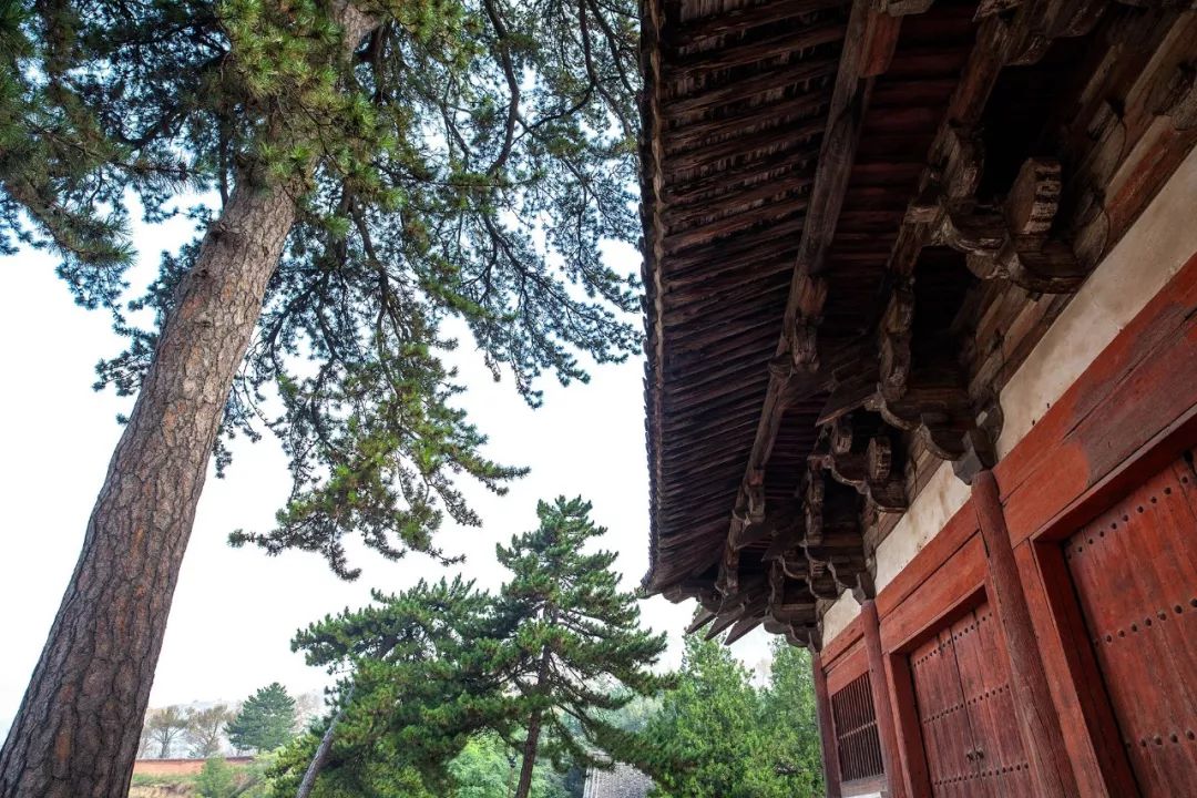 大殿门前有两株气势逼人的松树。经过树龄测算,我们发现它们已经有大概1200到1300年的历史,和东大殿存在的年代非常相近。推断建了东大殿以后,门口人为地又栽种了这两株松树,所以它们现在已经和大殿相伴千年了。