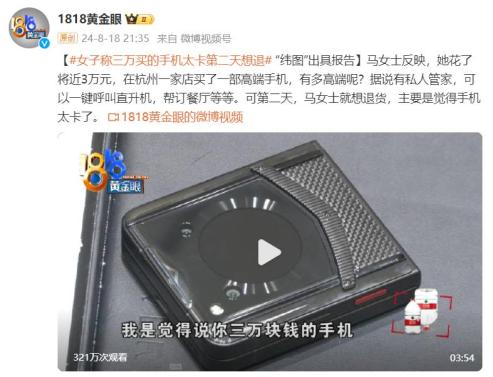 最近,《1818黄金眼》又贡献了一出当代社会离谱大赏:一女子花费近3万元,买了一部高端手机,结果第二天就想退货,原因是手机太卡……