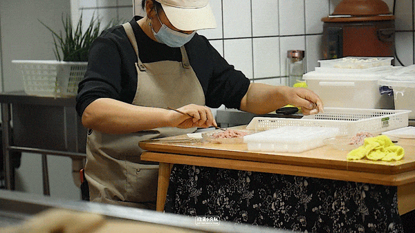 皮子都是手工擀制,包法也区别于小馄饨,先挑起1点肉馅,抹在馄饨皮子的一角,看似随手一捏,但恰恰也最考验手上功夫,既要包裹住肉馅,又要留足空气感。一整个就是薄薄薄,呈半透明状,甚至看得清里面的肉馅,煮熟后轻轻一抿,就在嘴里化开。为了维持泡泡感,馄饨里的肉馅一定要少。店里选用的是精品黑猪肉,味鲜肉劲。烫熟的,下锅后数着秒