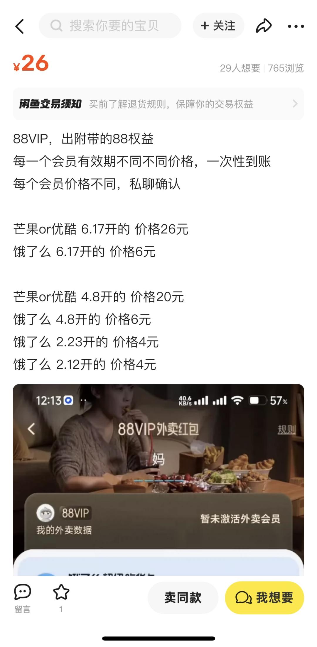 记者在二手交易平台发现,无论是在哪个平台搜索88VIP相关信息,前五条结果中往往夹杂着“转让88VIP部分权益”的交易信息,反映出不少用户倾向于将自身不需要的会员权益以更实惠的价格转让他人。