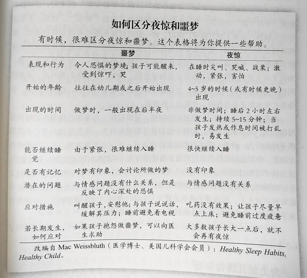 最后,4/5岁的孩子除了夜惊,也可能会因为做噩梦而突然半夜惊醒,那噩梦与夜惊如何区分呢?《美国儿科学会育儿百科》里也有两者的详细区别,爸爸妈妈们可以看一下