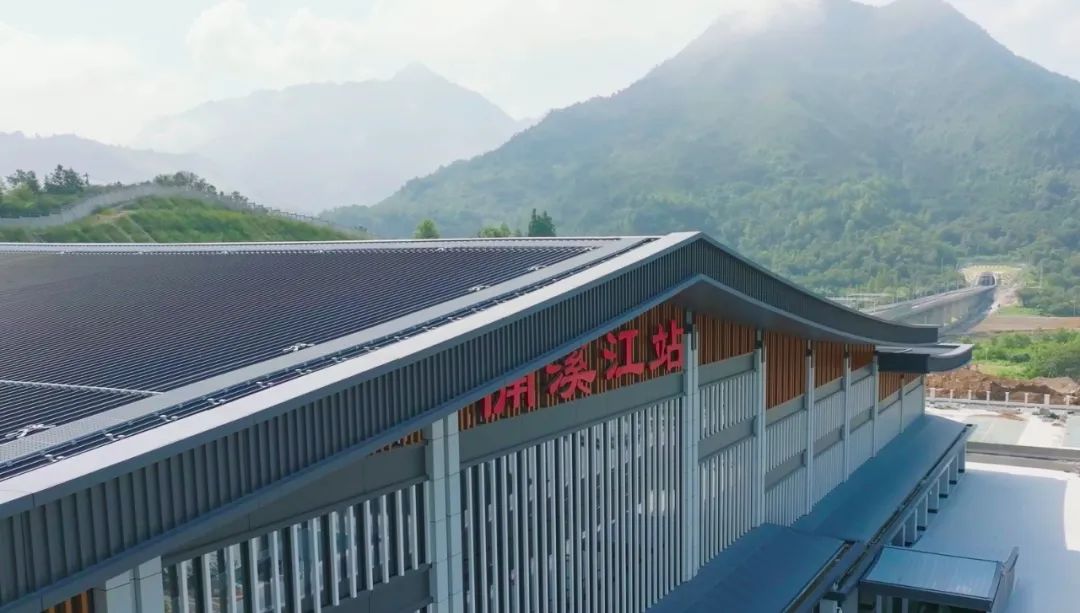 楠溪江站以“山水桃源·诗韵楠溪”为设计理念,站房轮廓以楠溪江中游古村落、古街为设计灵感,结合楠溪江独特的自然环境与人文风貌,将传统民居和现代建筑有机结合,建筑形态秀美灵动且富有诗意,诠释了楠溪江得天独厚的自然环境与人文风貌。