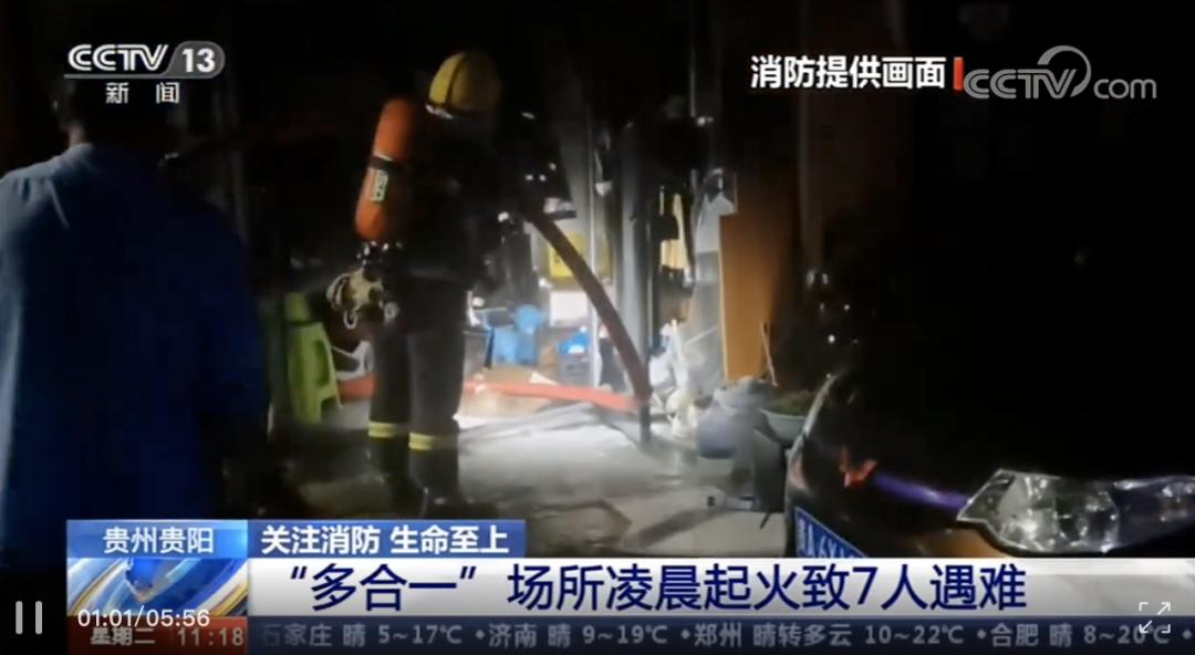 2020年7月8号凌晨5点,贵州贵阳一处汽车用品商铺发生火灾。起火楼房共三层,其中一层为生产经营门面,高5.8米,搭建夹层用于存货和住人,二层供人员住宿并设有厨房做饭,三层用于人员住宿,是典型的“多合一”场所。经过消防救援人员近一个小时的紧张扑救,大火被扑灭,被困在二楼和三楼的7人全部被找到,但均已遇难。