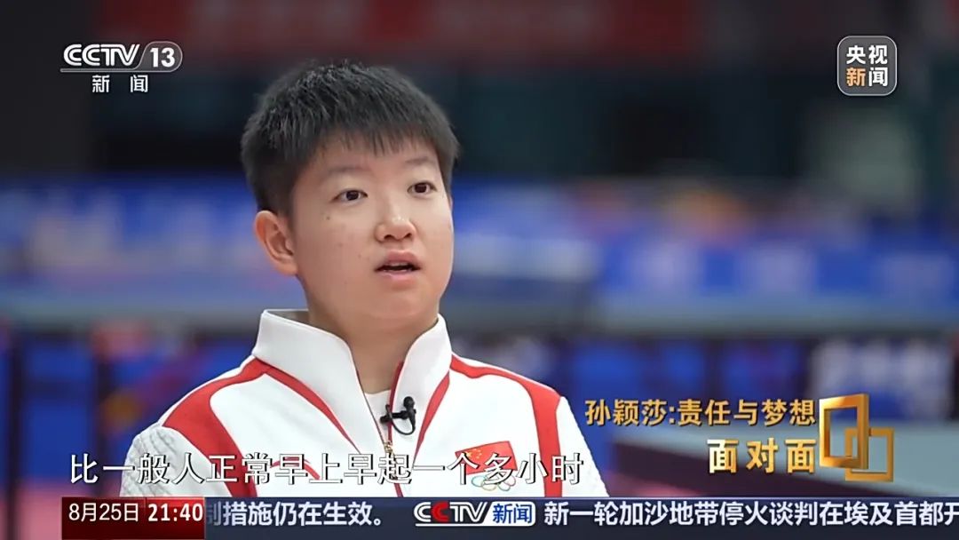 记者:因为你是三项,你还有女子单打,那你确保自己女子单打还得练,俩人还得练。你这一天怎么会多练出多少时间来呢?孙颖莎:就是早上出早操,比一般人正常早上早起一个多小时。
