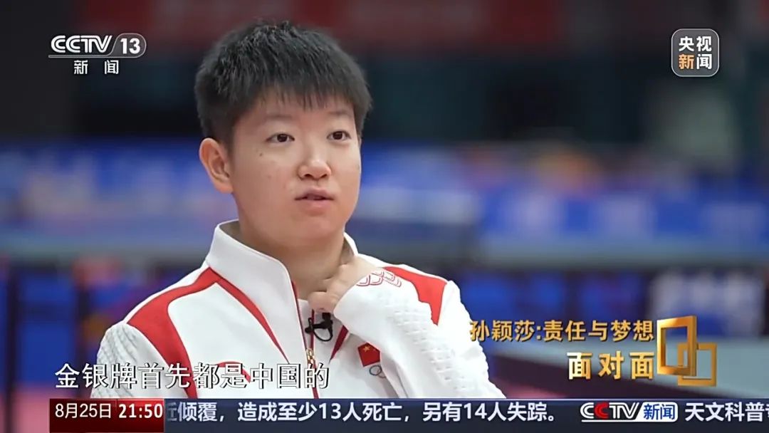 记者:我看过一个评论,说看完了你整个奥运会期间十来天的比赛,网友说的,他们说你完成了混双的比赛,得了这个金牌,这是任务,你完成了女团的这个比赛,得了冠军,这是责任,但是你输了个人的单项,女单的这个比赛,这是你的梦想。你在责任、任务上面都赢了,但是你在你追求梦想这一项上你得了一个银牌。你怎么看大家对你的这个总结?