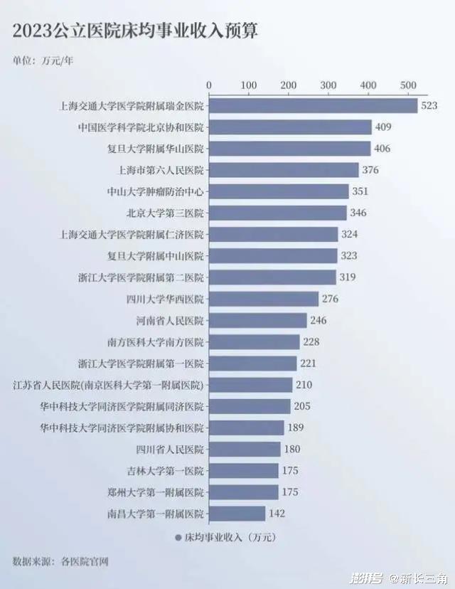 梁长玉作答:2023年数据显示,上海交通大学医学院附属瑞金医院官网显示核定床位数为2139张,但床均业务收入预算达到523万元,稳居榜首,几乎代表了国内公立医院的最高水平。