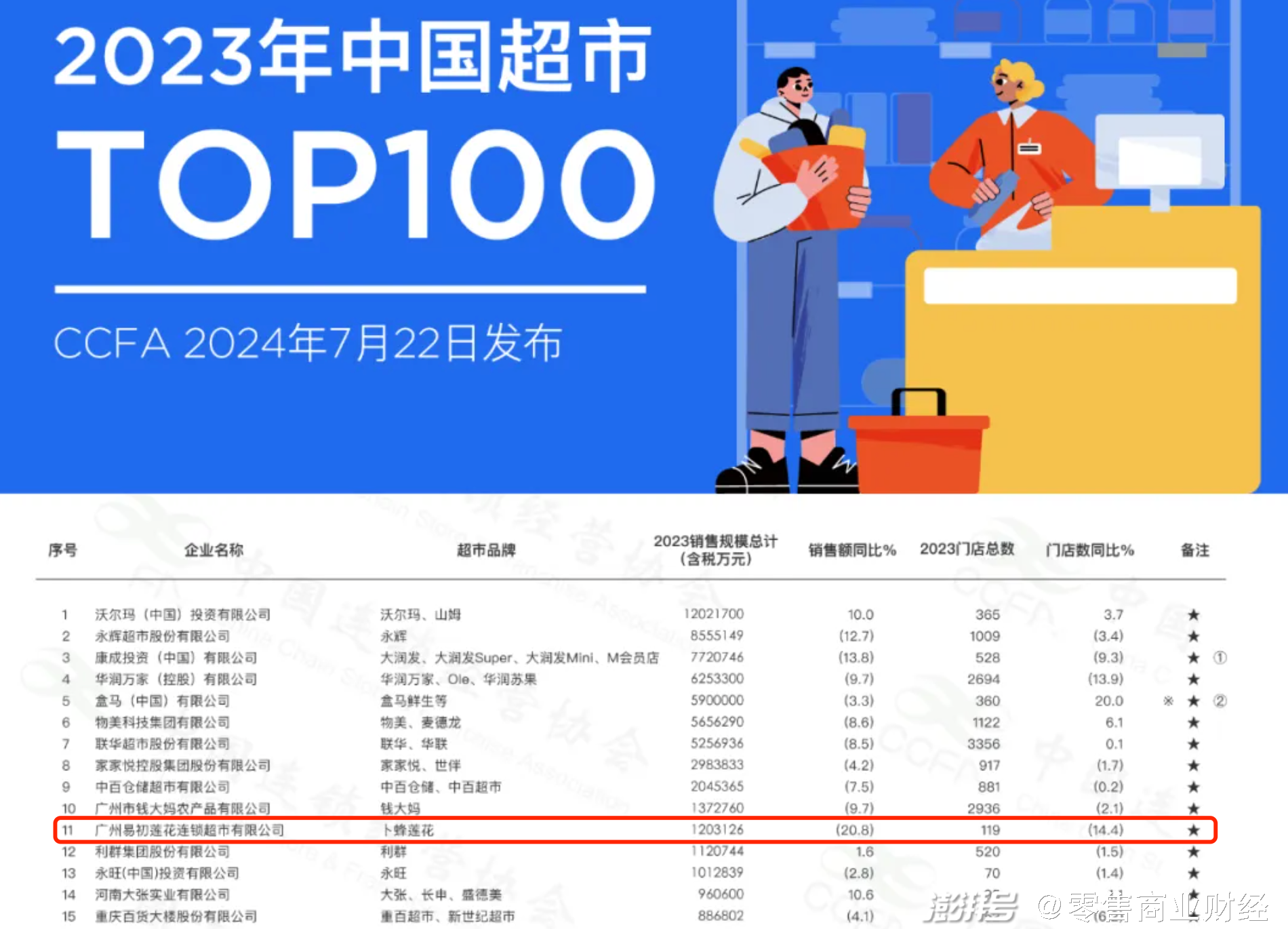 中国连锁经营协会(CCFA)发布的“2023年中国超市TOP100”显示,2023年国内超市的销售规模和门店数同比下降,其中传统大卖场跌幅尤为明显。永辉、大润发、华润万家销售规模和门店数双双下降,而位列第11名的卜蜂莲花,其销售额跌幅甚至超过20%,由2022年的151.9亿元跌至2023年的120.3亿元,门店数量也由2022年的142家缩减到2023年的119家。