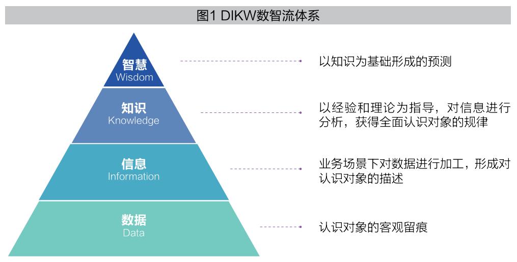 DIKW体系中,数据、信息、知识与智慧之间既有联系,又有区别(见图2)。数据是DIKW体系中最基础的一个概念,它是认识对象的客观留痕,是形成数据资产的最原始的素材。信息是有一定含义的、经过加工处理的、对决策有价值的数据,企业在业务场景下对原始数据进行加工处理形成的指标、特征、标签等,都可以称为信息。知识是在理论的指导下,通过智能化模型等提炼不同维度信息之间的关联获得的规律性认知。智慧是以知识为基础的正确的判断能力,关注的是对未来的预测。从采集数据、提炼关联信息、发现新规律、研究出新理论到创造新的知识或技术,是数据与实体二者不断迭代演进、归纳演绎形成普适智慧的过程。