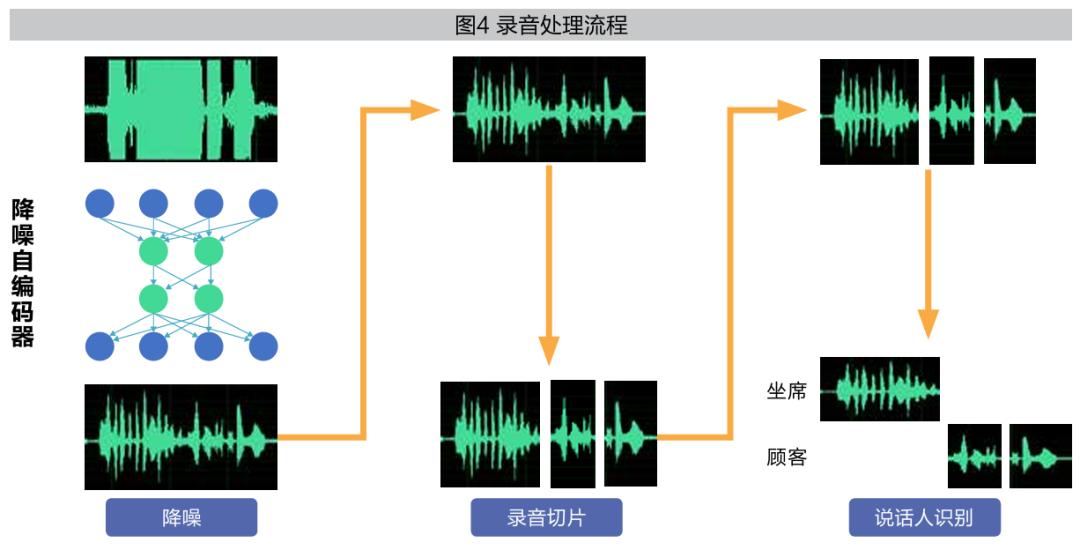 从数据到信息(对场景的描述)。在保险业务场景下,如果客户服务不好,就会降低客户满意度,进而影响客户留存。因此,客服质检是该保险公司的一个重要场景。高效精准的客服质检,不仅有助于提升服务质量,还能帮助企业在竞争激烈的市场环境中获取竞争优势,开拓新的市场份额。传统质检方式以人工手段(包括随机抽样质检和事后回访)为主,存在耗时长、结果延迟、人工成本高、样本规模小(只能完成所有通话记录的2%)、覆盖率低等问题。所以,该保险公司考虑以智能化方式升级和改造质检项目,提升质检效率。在该场景下,研究团队首先对2700通原始服务通话数据(超八千小时)进行数据降噪、录音切片、说话人识别等处理(见图4)。然后,给切片后的语音片段打上情绪标签,作为训练数据。通过CNN训练模型,判断出客户在一通服务通话中的情绪变化(见图5)。通过对非结构化原始数据的加工处理,形成对决策有价值的情绪数据即信息。