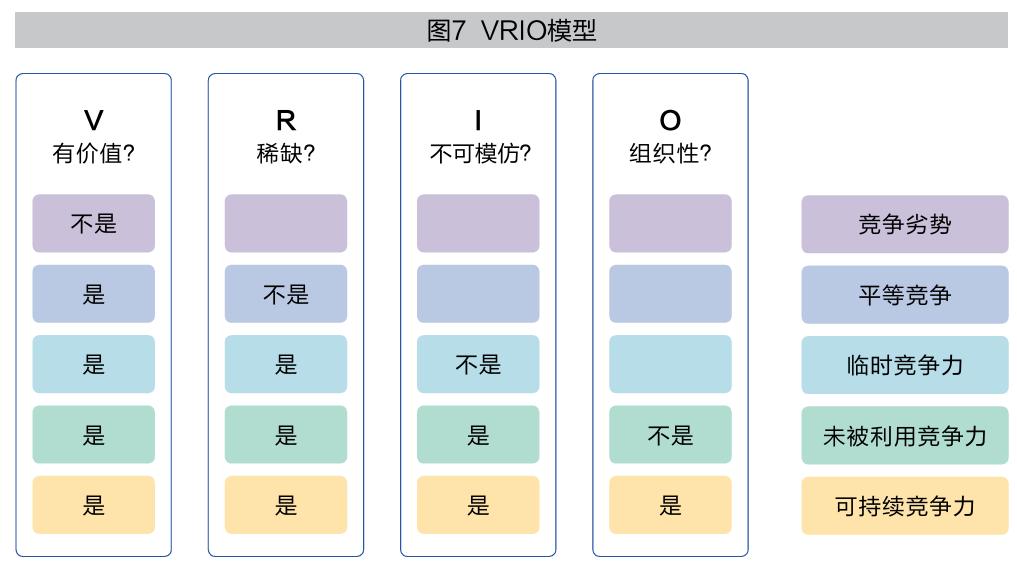 企业能够在市场上长期立足,是因为拥有核心竞争力。1991年杰恩·巴尼(Jay B. Barney)提出VRIO模型(见图7),帮助企业分析竞争优势和弱点,明确企业的资源和能力,正确评估有潜力成为企业可持续竞争优势的资源或能力。该模型指出有四个因素影响可持续竞争优势,分别为:有价值(Valuable),即企业的资源和能力能增加价值;稀缺(Rarity),即具有大部分或者所有竞争者没有的资源或能力;不可模仿(Inimitable),即资源不容易被模仿;组织性(Organization),即企业被有效组织起来。四个因素都满足时,企业才能获得可持续的竞争优势。