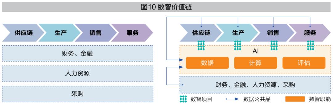 数智价值链就是在波特提出的经典价值链(见图10左)基础上增加一个数智活动(见图10右)。“数”指企业在运行过程中产生的大数据,“智”指人工智能等分析技术。在数字经济时代,数智活动将成为企业价值链必不可少的价值增值活动,成为企业价值链中的关键一环。总体来看,数智价值链中的数智活动具有三个职能。