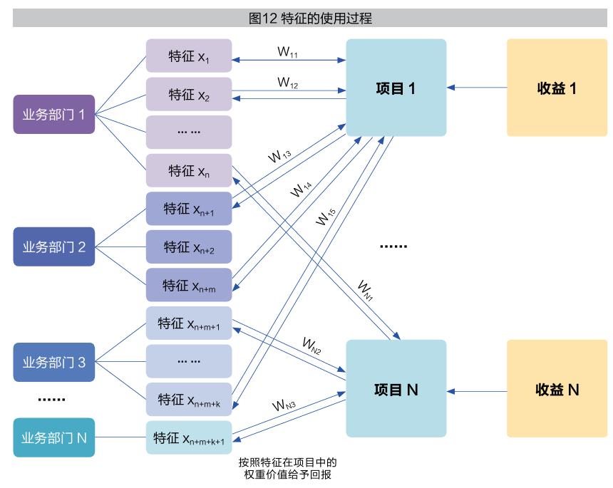 机器学习为衡量各个部门的数据绩效、促进企业内部市场化提供了解决方案。机器学习通常使用一些特征描述样本属性,并以特征权重反映特征对目标变量的影响程度,以此衡量特征的重要性。如图12所示,实施项目1的过程中,使用了5个特征,其中,业务部门1提供两个特征,业务部门2提供两个特征,业务部门3提供一个特征。项目1为企业带来经济收益后,将计算每个特征在项目中的重要性,并按照特征在项目中的权重价值给予回报。基于定量方法建立的企业内部市场机制,有助于数据要素流通产品价格的形成,有助于提出面向不同应用场景的数据产品定价、收益评估方法,从而建立公平高效的收益分配机制,完善数据要素由市场评价贡献、按贡献决策报酬的相关机制。