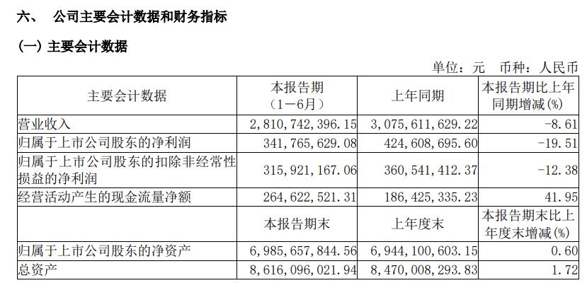 华熙生物半年报显示,营收28.11亿、同比下滑8.61%,归母净利润3.42亿、同比下滑19.51%,扣非净利润3.16亿、同比下滑12.38%,净资产69.86亿、同比微增0.6%,总资产86.16亿、同比小幅增长1.72%。