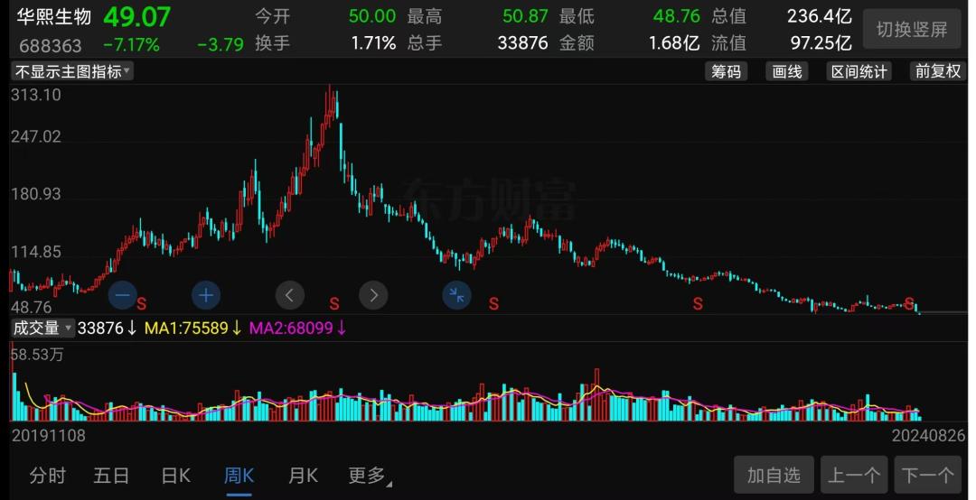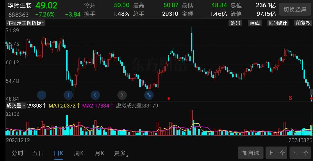 (华熙生物半年报截图)不过,市场可不看你经营现金流是否增长,只看你净利润是否增长,结果就是,今天一开盘华熙生物的股价即低开超6%,随后持续下探,盘中一度跌超7%,股价再创上市以来新低!