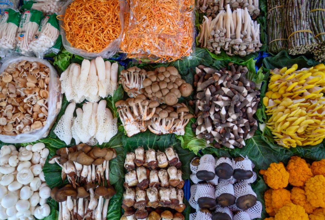 左图:走进昆明篆新农贸市场,像是走进了一幅“七彩云南”的生活图鉴,汇聚于此的各色美味让人流连忘返。沈星 摄右图:松茸、牛肝菌、鸡油菌……大山里的精华汇聚在篆新农贸市场,平凡日子里的小幸福交汇在这里。沈星 摄