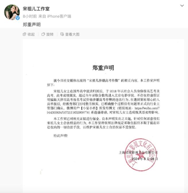 女演员宋祖儿方否认涉嫌高考作弊,工作室深夜再发声明