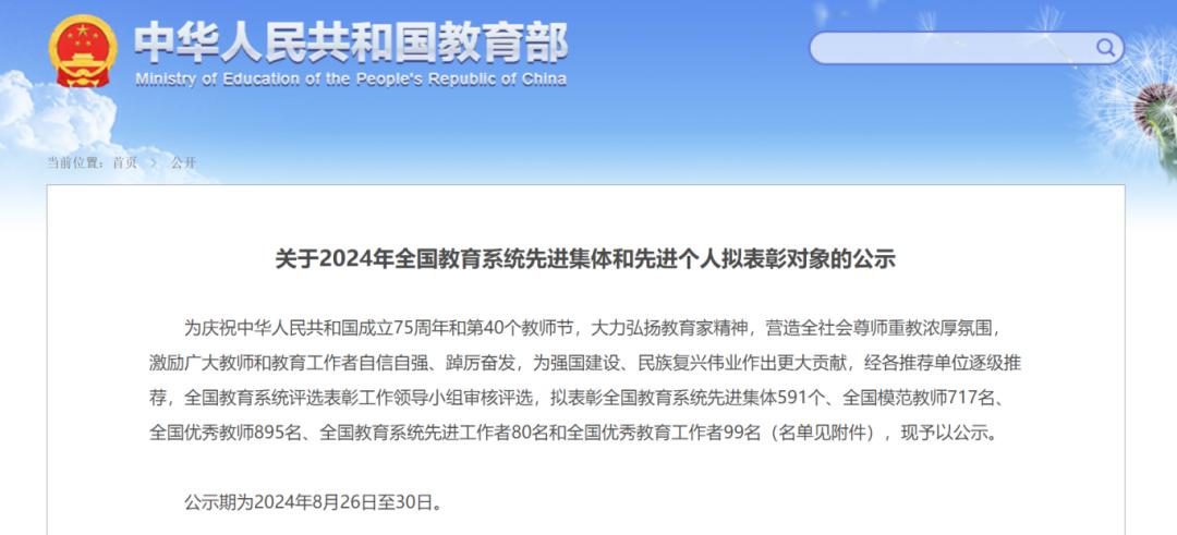 8月26日,教育部官网发布了《关于2024年全国教育系统先进集体和先进个人拟表彰对象的公示》。经各推荐单位逐级推荐,全国教育系统评选表彰工作领导小组审核评选,拟表彰全国教育系统先进集体591个、全国模范教师717名、全国优秀教师895名、全国教育系统先进工作者80名和全国优秀教育工作者99名。