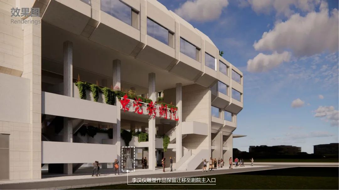 影剧院主入口改造效果图(上)、李汉仪创作女神像(下)值得一提的是,改造项目也关注到了东莞影剧院作为本土粤剧文化重要根据地的角色,计划进一步修缮影剧院原来的粤剧专业舞台。