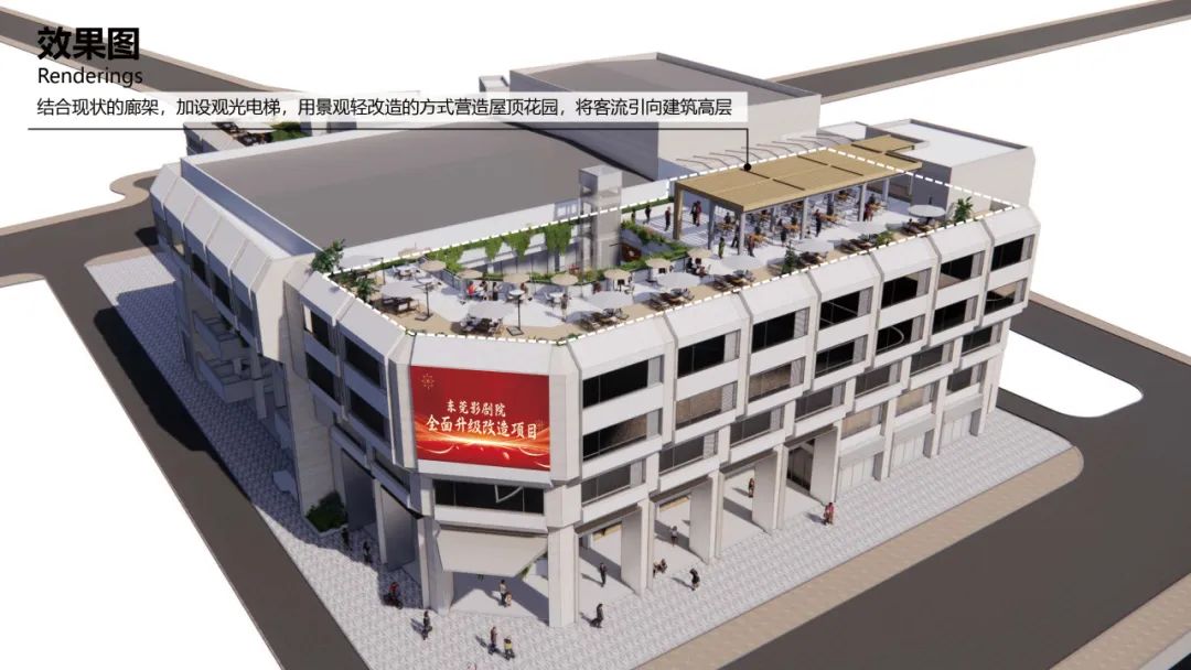影剧院的楼顶,计划营造屋顶花园并引入轻餐饮、空中休闲吧、音乐餐吧等业态,在这里眺望莞城,视线沿着迎恩门穿梭至老街窄巷、高低屋顶,大概是多数人不曾感受过的风景。