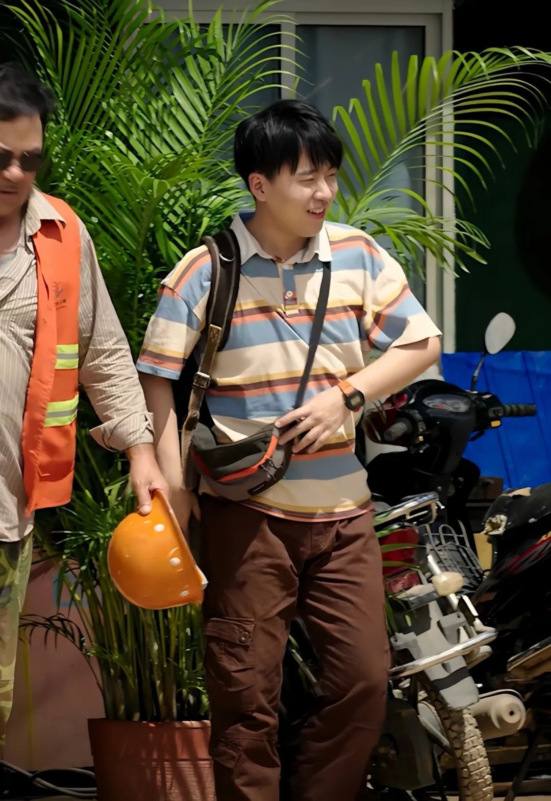 刚到建筑工地的沈星白白嫩嫩,发型清爽,以条纹Polo衫搭配休闲长裤和斜挎包为整体造型,手上佩戴没那么成熟的手表,眼神中透露着刚毕业学生所有的“清澈的愚蠢”。