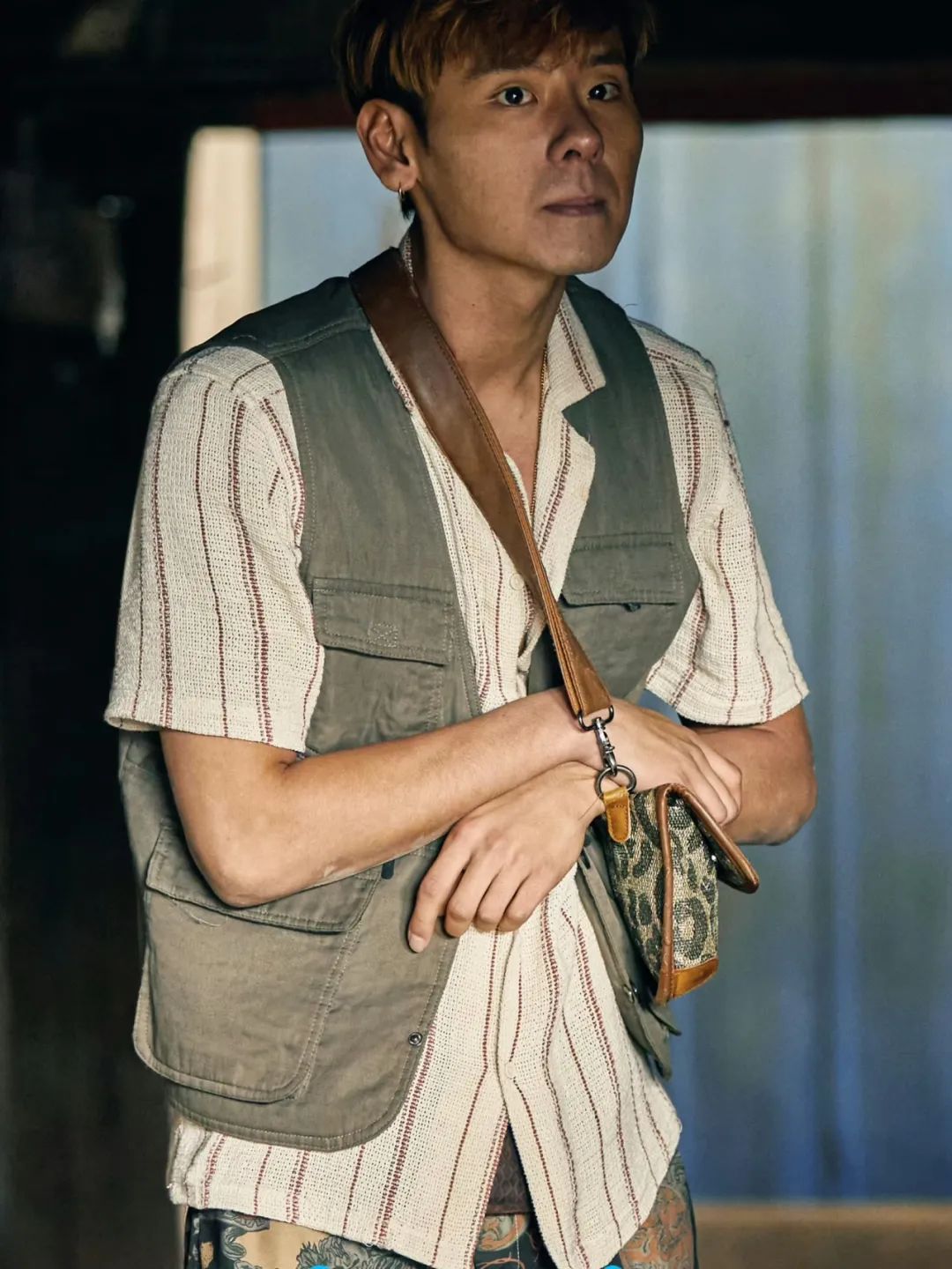 他的着装更倾向于游击军装风,经常戴着一条边缘起毛的头巾,脸上脏兮兮的,像画了雀斑妆,手腕上缠着布条,穿着工装、无袖上衣或衬衫,连背的包都是工具包。